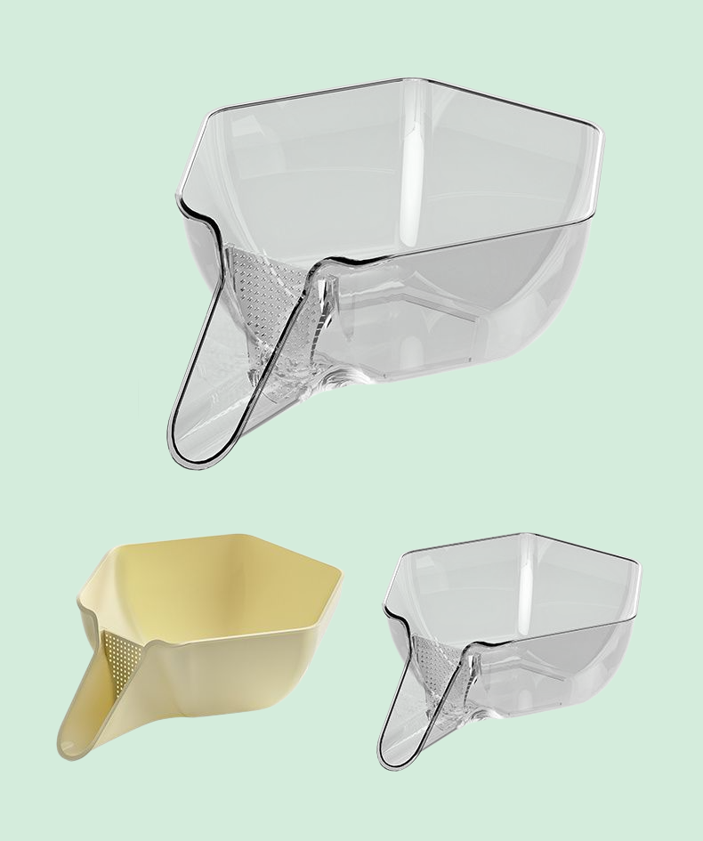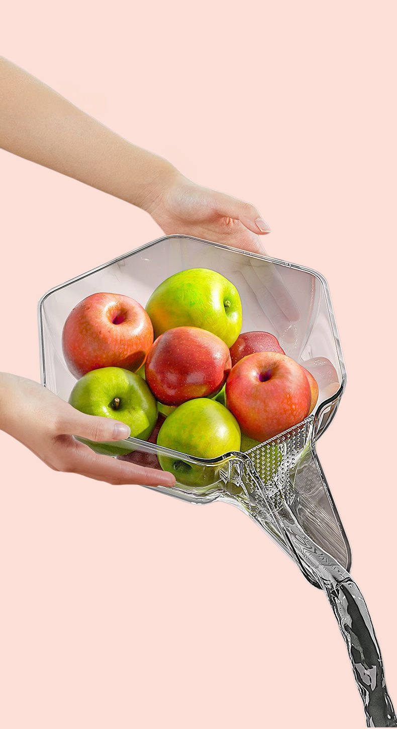 排水機能付き多機能バスケット。野菜や果物の洗浄・収納に最適。耐久性のあるプラスチック製でキッチン整理に便利。