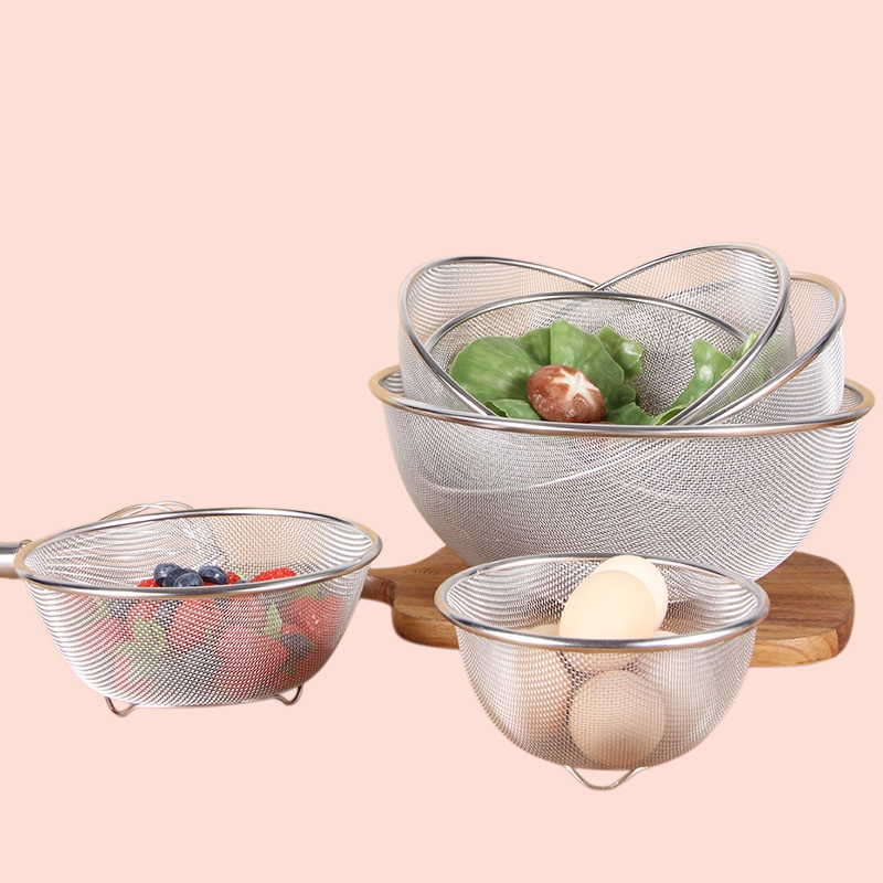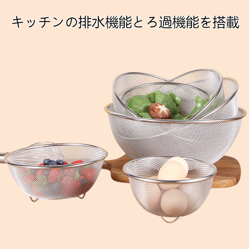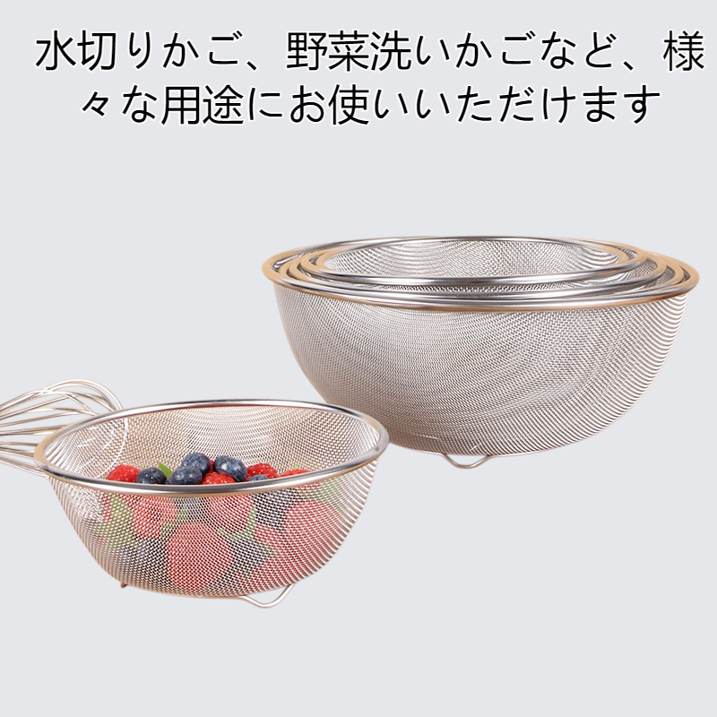 厚みのあるステンレス製で耐久性抜群。排水かご・米洗いふるい・野菜洗いかごとして多用途に使える。キッチンの水切りやフィルター機能付きで衛生的。